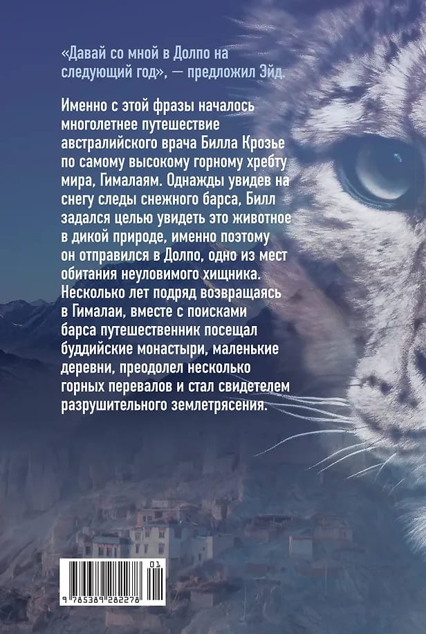Жажда приключений и новых открытий привела австралийского врача Билла Крозье к многолетним странствиям по Гималаям. Однажды увидев на снегу следы снежного барса, Билл задался целью увидеть это животное в дикой природе, именно поэтому он отправился в Долпо, одно из мест обитания неуловимого хищника. Несколько лет подряд возвращаясь в Гималаи, вместе с поисками барса, путешественник посещал буддийские монастыри, маленькие деревни, преодолел несколько горных перевалов и стал свидетелем разрушительного землетрясения.