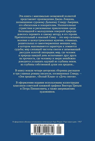 В книгу вошли четыре авторских сборника рассказов и три главных романа писателя, посвященных Северу, — «Зов предков», «Дочь снегов» и «Белый Клык». В оформлении издания использованы иллюстрации классиков советской книжной графики Виктора Цигаля и Петра Пинкисевича, а также американских художников.