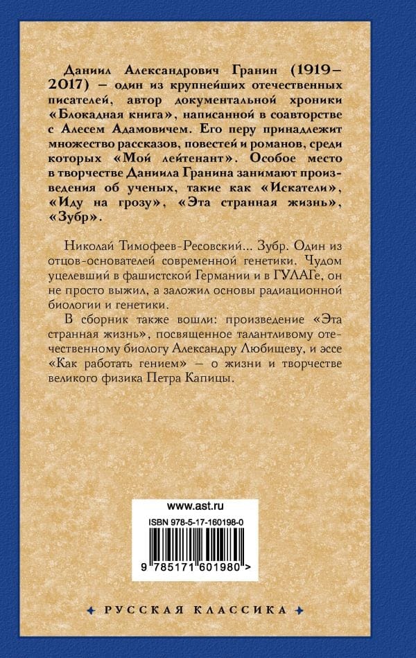 Николай Тимофеев-Ресовский… Зубр. Один из отцов-основателей современной генетики. Чудом уцелевший в фашистской Германии и в ГУЛАГе, он не просто выжил, а заложил основы радиационной биологии и генетики. В сборник также вошли: произведение "Эта странная жизнь", посвященное талантливому отечественному биологу Александру Любищеву, и эссе "Как работать гением" — о жизни и творчестве великого физика Петра Капицы.