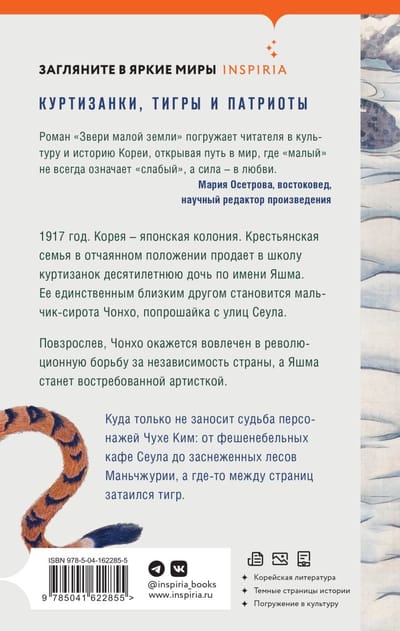 1917 год. Корея — японская колония. Крестьянская семья в отчаянном положении продает в школу куртизанок десятилетнюю дочь по имени Яшма. Ее единственным близким другом становится мальчик-сирота Чонхо, попрошайка с улиц Сеула. Повзрослев, Чонхо окажется вовлечен в революционную борьбу за независимость страны, а Яшма станет востребованной артисткой. Куда только не заносит судьба персонажей Чучхе Ким: от фешенебельных кафе Сеула до заснеженных лесов Маньчжурии, а где-то между страниц затаился тигр.