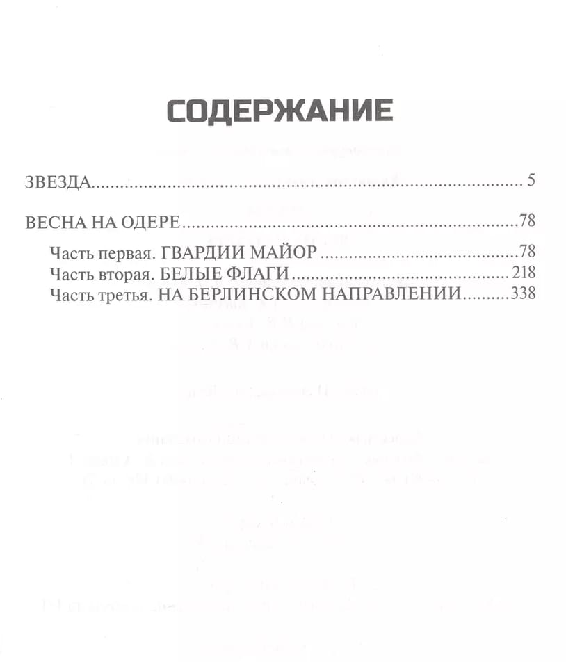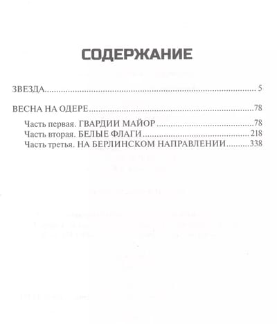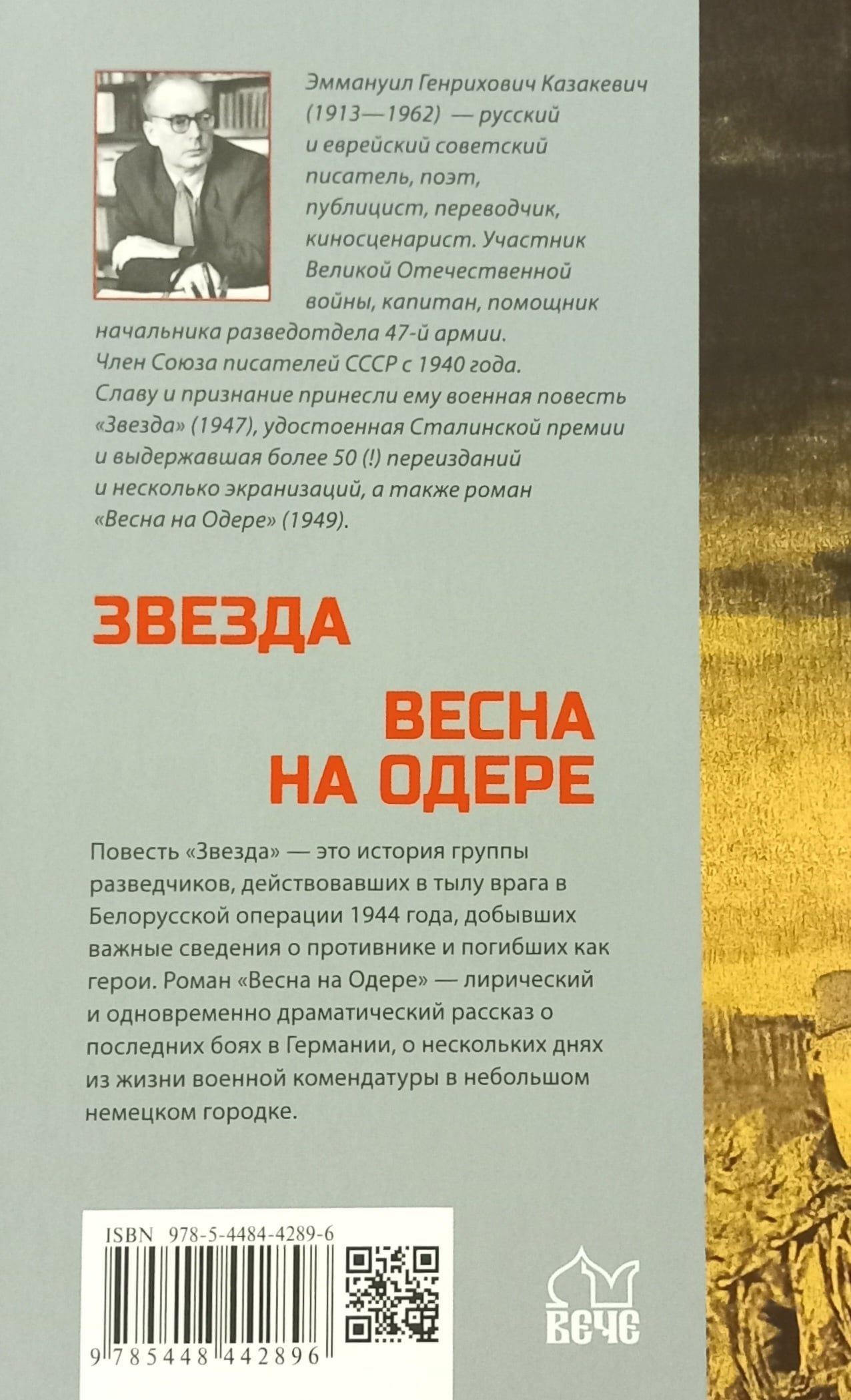 В книгу известного писателя Эммануила Казакевича включены наиболее значимые для его творчества произведения. Военная повесть «Звезда», принесшая автору славу и признание, удостоенная Сталинской премии и выдержавшая более 50 переизданий и несколько экранизаций. Это история группы разведчиков, добывших важные сведения о противнике и погибших как герои. Роман «Весна на Одере» — лирический и одновременно драматический рассказ о последних боях в Германии, о нескольких днях из жизни военной комендатуры в небольшом немецком городке.