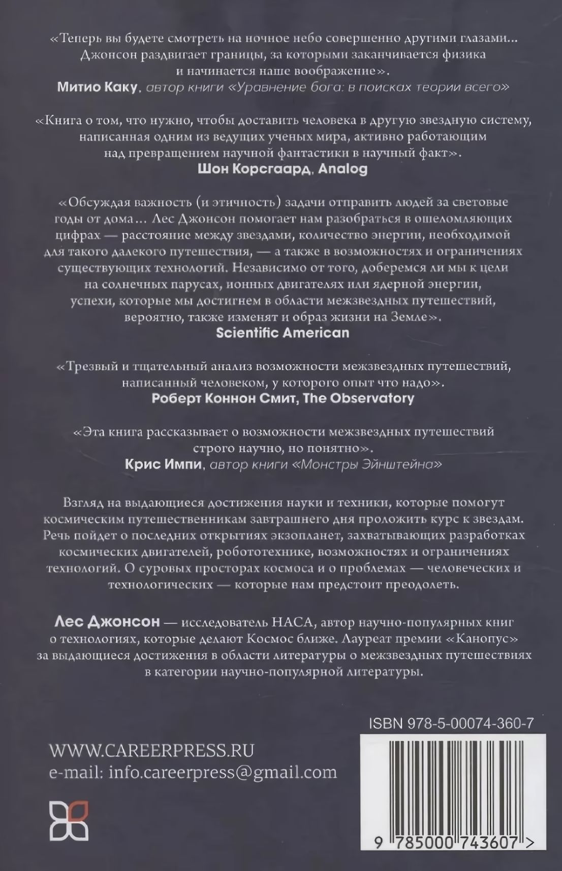 Джонсон поведет вас в захватывающее путешествие по физике и технологиям, которые позволят нам достичь звезд. Он расскажет о последних открытиях экзопланет, о многообещающих межзвездных полетах в уже не столь отдаленном будущем и о захватывающих разработках космических двигателей, об энергетике, робототехнике, связи и многом другом.